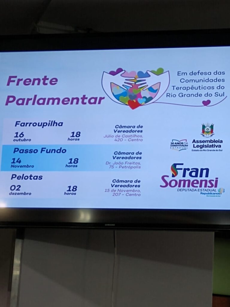 No dia 9 de setembro de 2019, no Plenarinho da Assembléia Legislativa do Rio Grande do Sul, em parceria com Delegacia FEBRACT-RS, foi lançada a frente Parlamentar Gaúcha em defesa das Comunidades Terapêuticas.