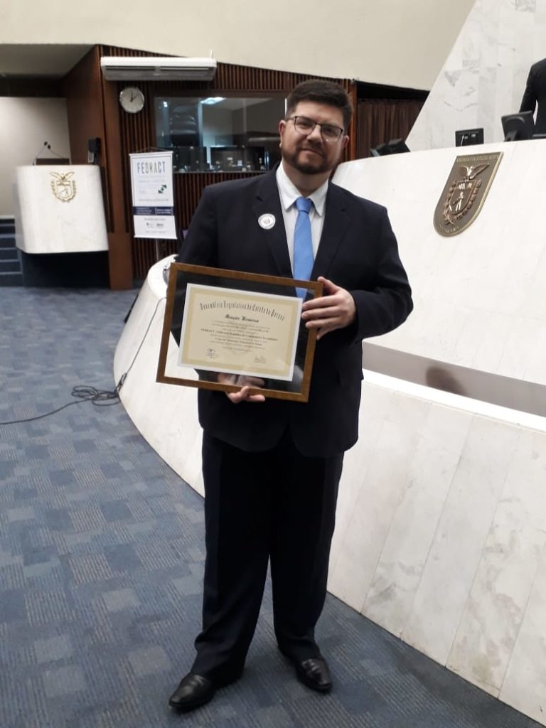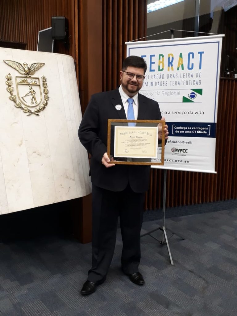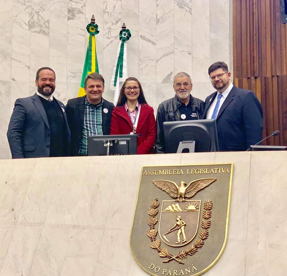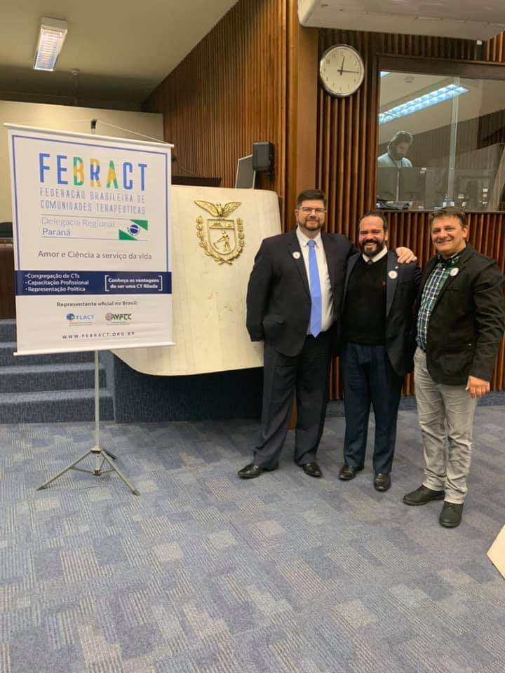 O Secretário de Prevenção e Cuidados, referente ao uso nocivo de drogas, responsável pelas políticas de incentivo ao acolhimento de Dependentes Químicos nas CT’S, Dr. Quirino Cordeiro, o Procurador Geral da FEBRACT e Psicólogo, Ricardo Valente e o Delegado da FEBRACT-PR, Marcelo Fortunato participaram de Sessão Solene na Alep PR em homenagem as Comunidades Terapêuticas.
