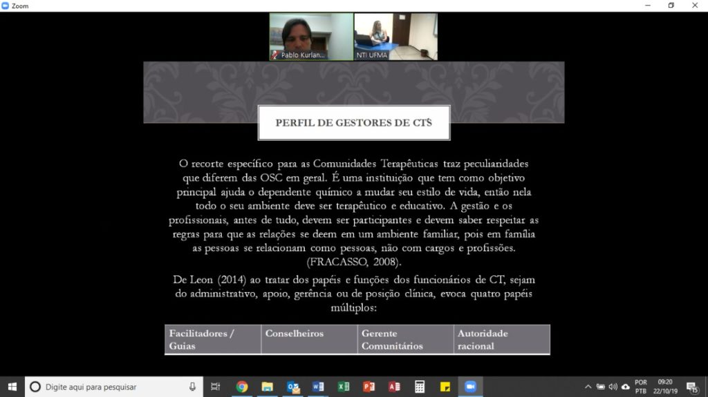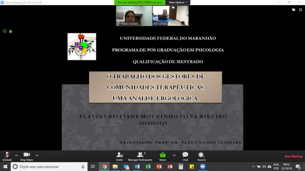 No dia 22 de outubro de 2019, a Psicóloga Flávia Cristiane Mouzinho Silva Ribeiro, defende a qualificação do seu mestrado com pesquisa movendo a avaliação da equipe da Comunidades Terapêuticas, com o tema escolhido: O trabalho dos Gestores de Comunidades Terapêuticas: Uma análise Ergológica. O Gestor Geral da FEBRACT, Pablo Kurlander participou da banca da qualificação do mestrado online. Flávia faz parte da Delegacia FEBRACT no Maranhão e atua na CT no Maranhão, a CTM, como Psicóloga.