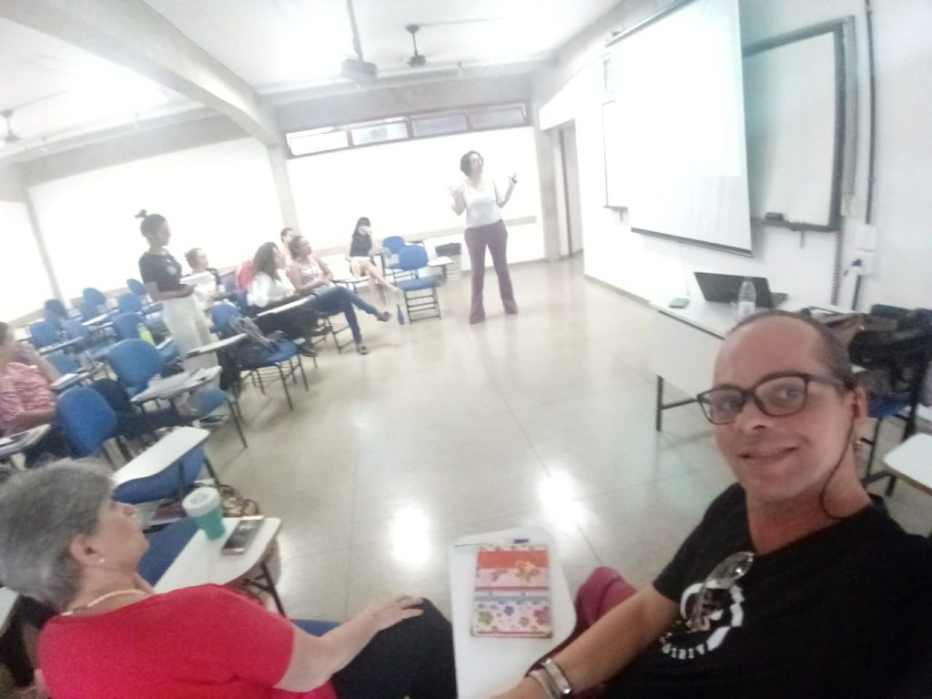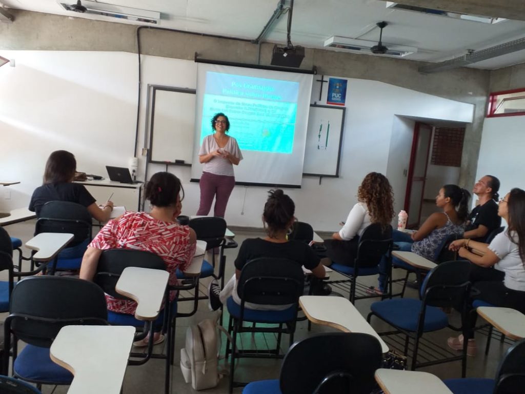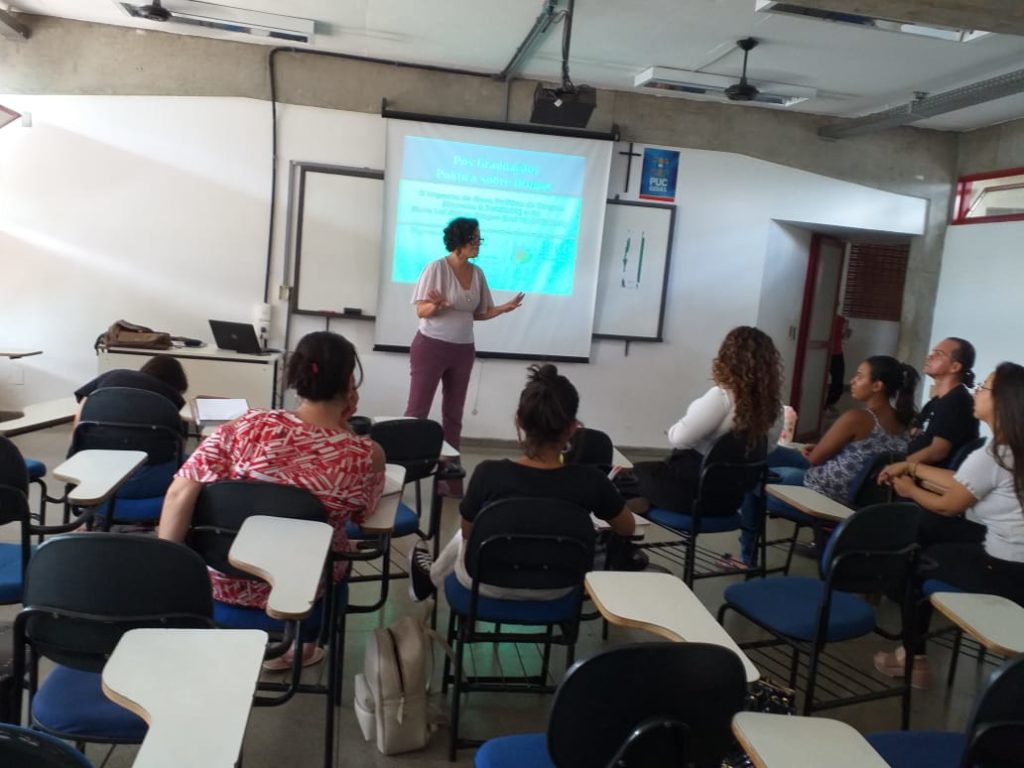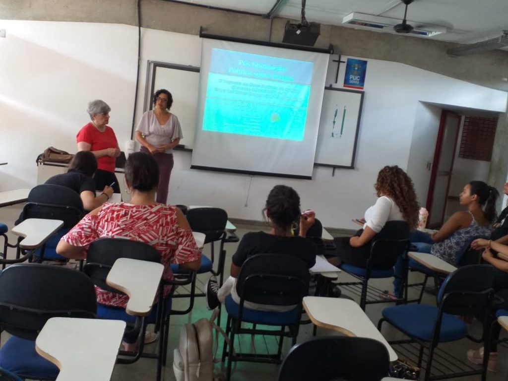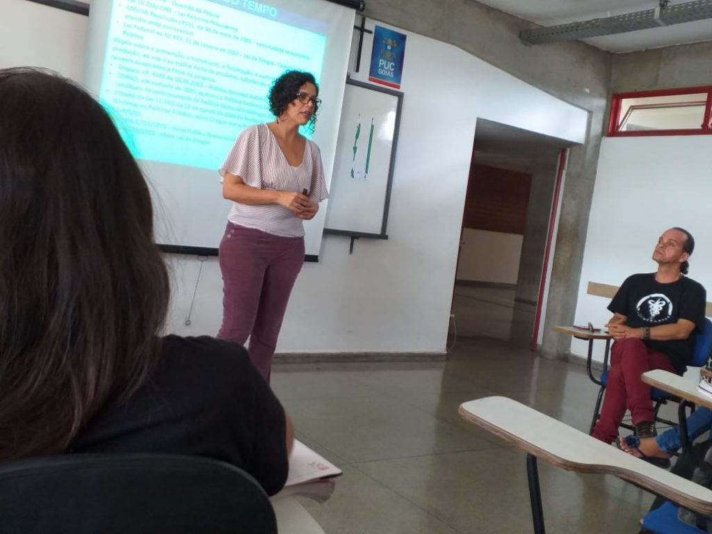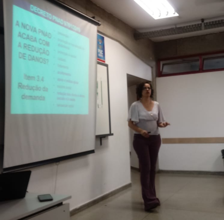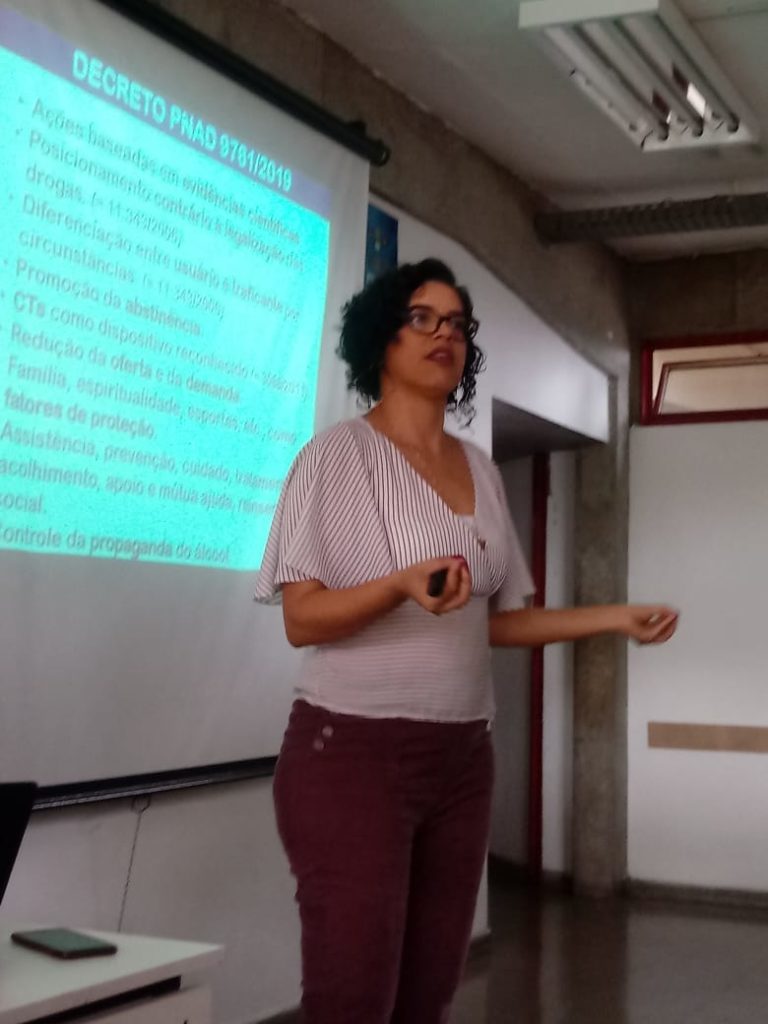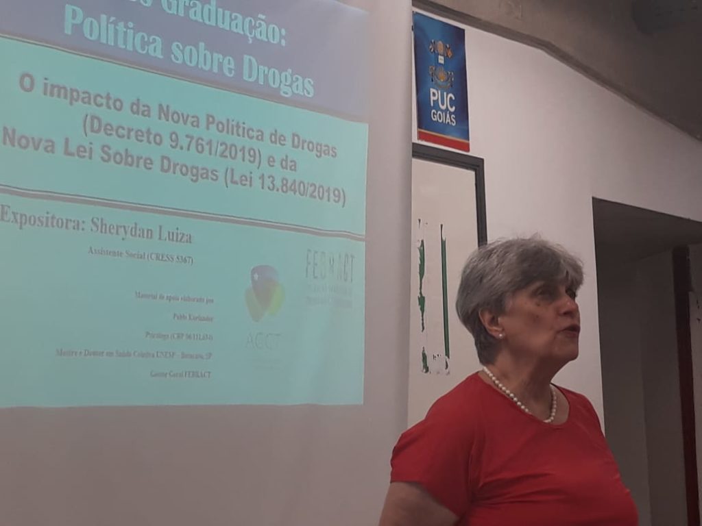 A convite da professora Vera Morcelli do programa de extensão PNV da PUC Goiás, Sherydan Luiza, assistente social e delegada regional da FEBRACT em Goiás palestrou sobre “Os impactos das novas política e lei nacional de drogas” no grupo de estudos sobre álcool e outras drogas.