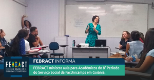 A convite da professora Ms. Karine Teixeira da FacUnicamps, a delegada regional da FEBRACT Goiás Sherydan Luiza e Marília Bispo assistente social e responsável técnica desta CT, ministraram aula para acadêmicos do 8° Período do Serviço Social da FacUnicamps em Goiânia.